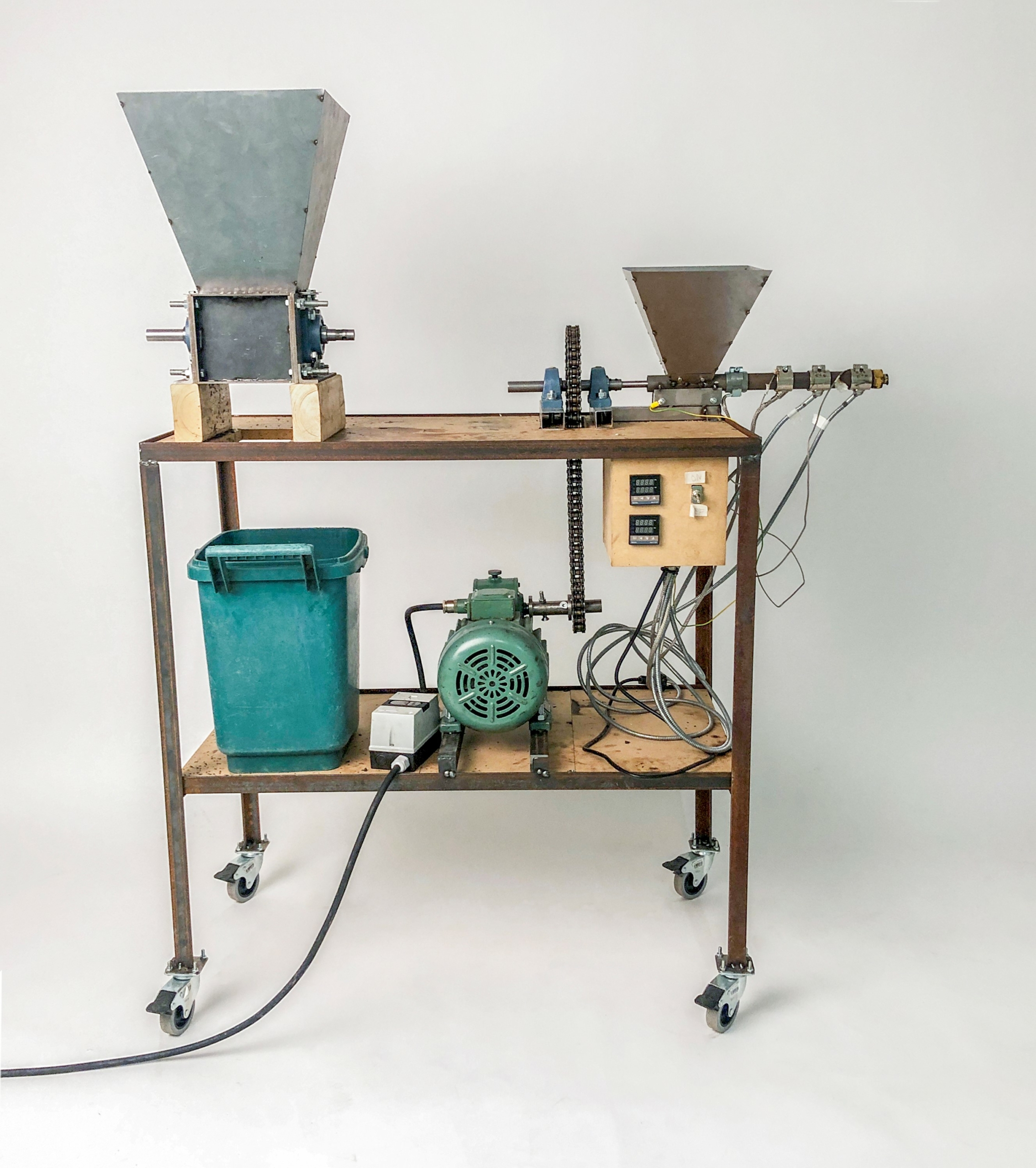 Fotot visar en maskin som undersöker möjligheten att använda plastavfall som en resurs. Maskinen är byggd av designer Ina Johansson Lidman som deltar under Designkollot. Ursprungsmaskinen är skapad av Dave Hakkens, Precious plastic.
