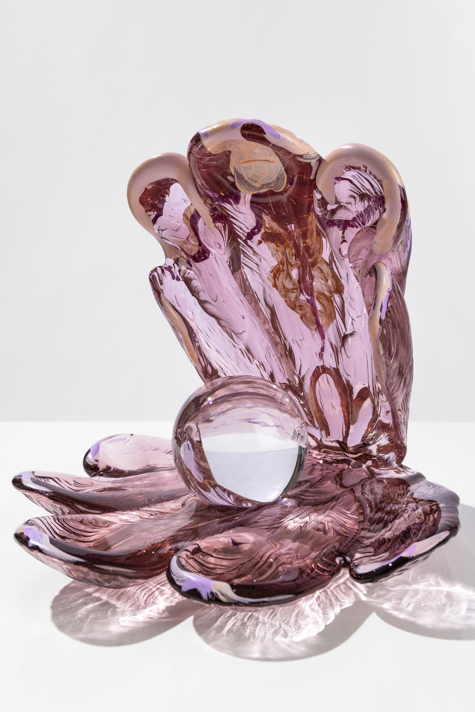 Åsa Jungnelius is a Swedish artist, educated at Konstfack. The glass sculpture “Vongole” represents a shell with a pearl in the gap. The pearl reflects the world upside down, which can be seen as an opportunity to see things in a new way and gain new perspectives. First the mould for the shell was made, in a refractory material with an angle grinder, where the hole in the mould forms the shape of the shell, while the glass bead itself is sculpted separately. Just before the glass mass solidifies, the two parts are assembled. The shell is a recurring motif in Åsa Jungnelius’ art.