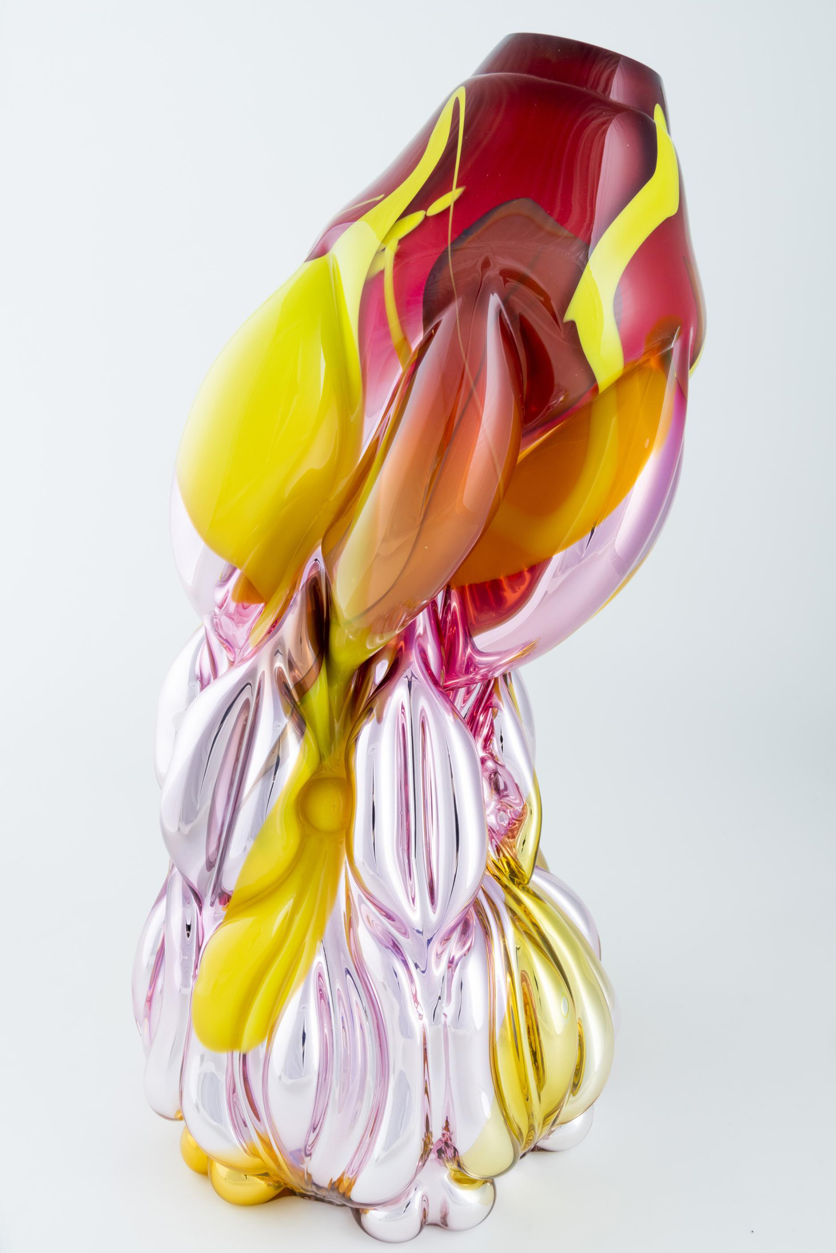 Hanna Hansdotter is a Swedish artist and designer educated at Konstfack. Kiss my lips and Stucco are part of the series Fading Prints, which is a collection of sculptures that borders between a decorative and a random creation. The objects are made in a technique based in an industrial environment and production, with the intention of repetitively creating unique objects with bombastic expressions. These sculptures are made of blow-molded and silver-plated glass and decorated with glass paint.