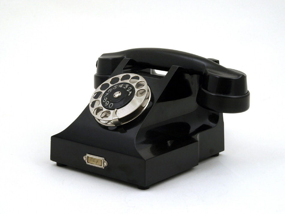 Den här svarta telefonen i bakelit och nickelpläterad mässingsplåt formgavs 1928/1929 av Bauhausformgivarna Richard Schadewell och Marcel Breuer och tillverkades för ett bostadsprojekt i Frankfurt.