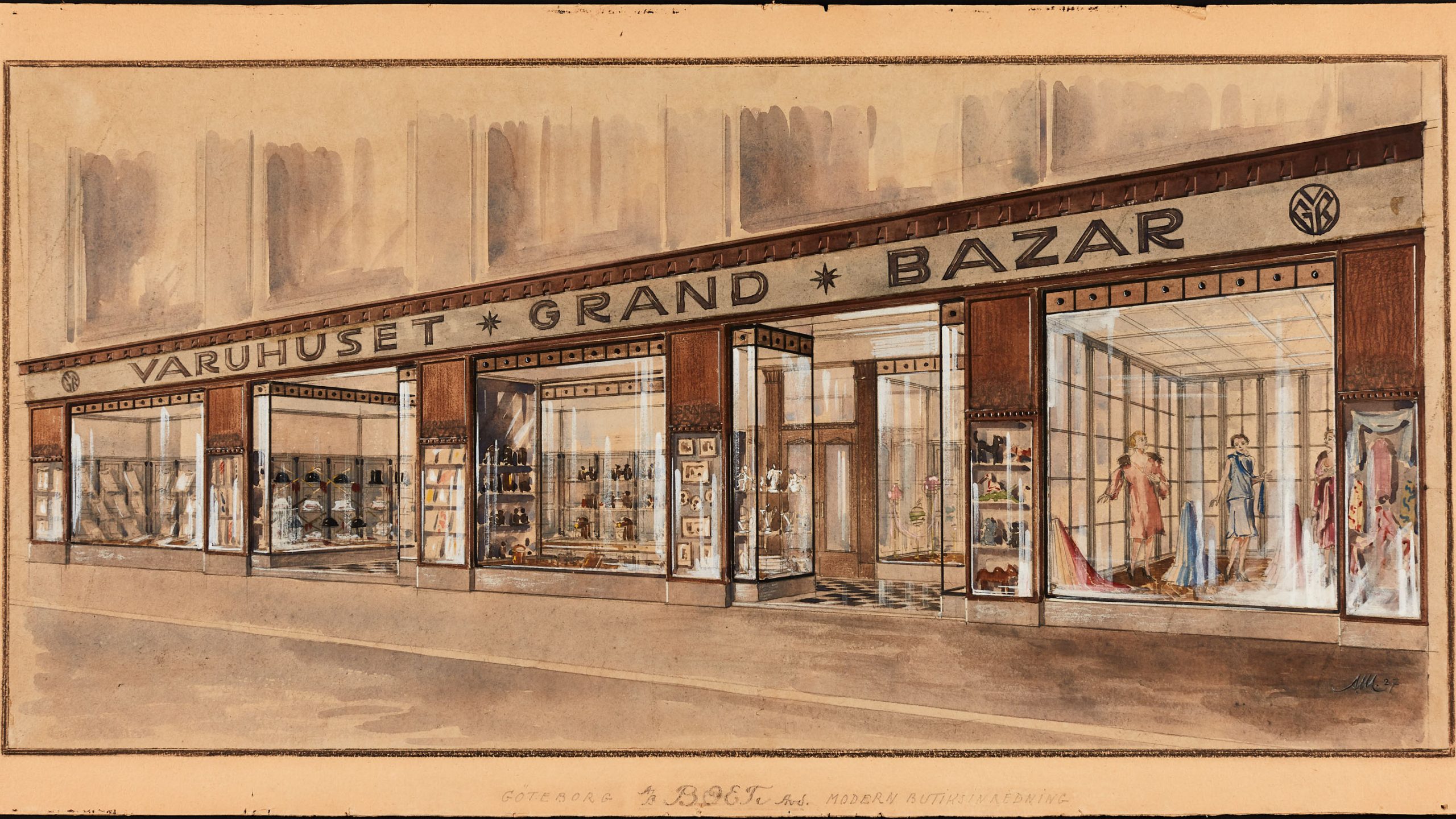 Bild: Ritning i akvarell och tempera föreställande fasadexteriör, för Grand Bazar, Göteborg, 1922, Otto Schulz, Boet. Foto: Carl Ander, Röhsska museet.