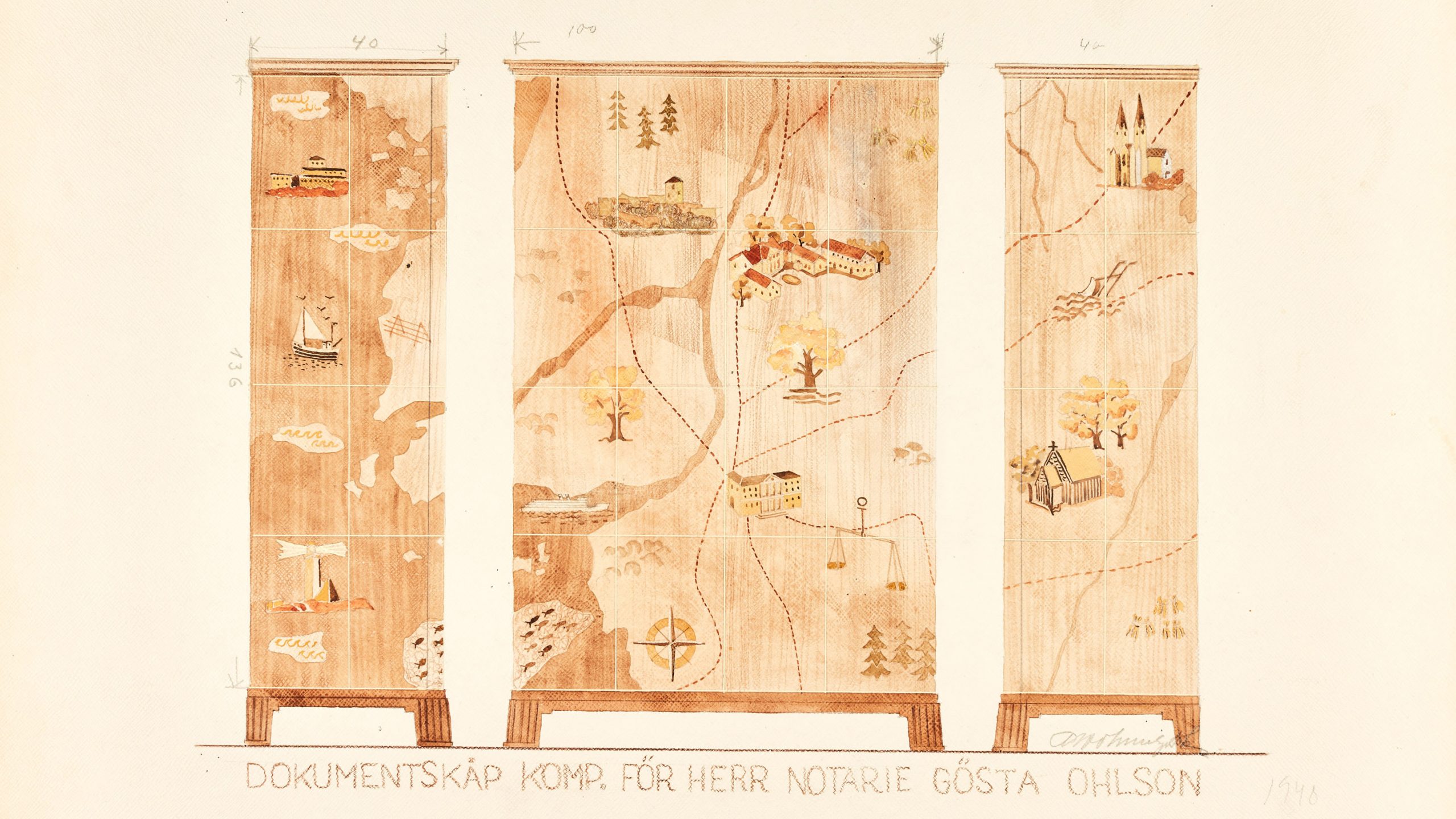 – En favorit är akvarellen som visar ett skåp som byggdes 1945. Skåpet är nog en av Schulz mest avancerade möbler, men skickligt utförd intarsia som visar Göteborg med omnejd. Akvarellen visar på detaljnivå hur skåpet kom att bli.